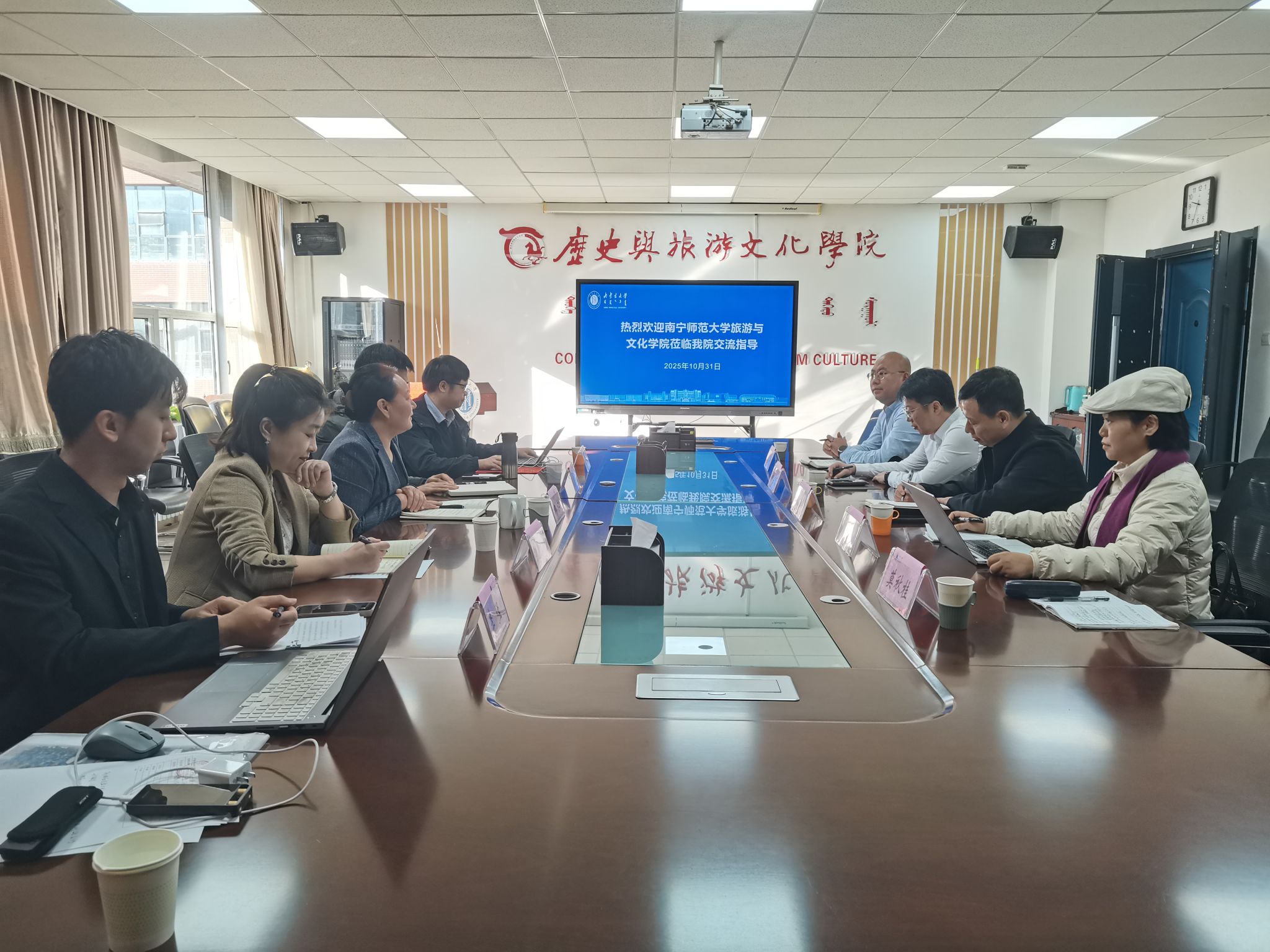 在内蒙古大学历史与旅游文化学院,该院的党委书记娜仁对调研团队的到来表示欢迎,并介绍了该院的历史沿革、基本概况及就业工作整体情况;卫银栋副书记、旅游管理负责人、MTA中心主任详细阐述了旅游管理专业的培养体系、师资建设及科研与实践融合的具体举措。随后,双方围绕党建工作、旅游管理专业建设、学生工作、MTA培养及青年教师发展等议题进行了深入交流,就专业建设路径、学生培养模式与师资发展机制等分享经验、共商对策。该院在学科建设与人才培养方面的系统规划,为学院“十五五”期间旅游管理学科的发展提供了有益思路。