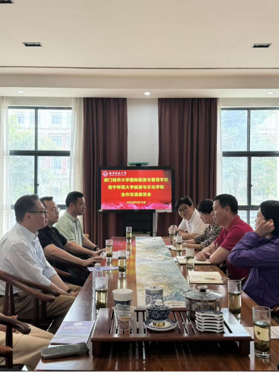 讲座后,双方举行合作交流座谈会。段文军院长详细介绍了学院的人才培养体系、旅游管理学科特色及社会服务成效。沈华文博士则分享了澳门城市大学的办学特色与优势,重点介绍了该校在旅游学科领域的建设成果及硕士、博士培养情况,并表达了与学院深入合作的意愿。经充分交流,双方在学生联合培养、升学发展、国际学术资源共享等方面达成初步合作意向和举措。