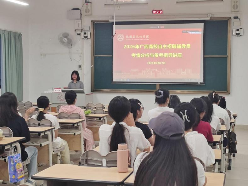 在武1-120教室举办2026年广西本科及高职院校辅导员招聘政策与备考指导专题讲座。讲座特邀资深公考专家肖钧泽老师主讲,学院邵依娜老师主持,来自成人动漫